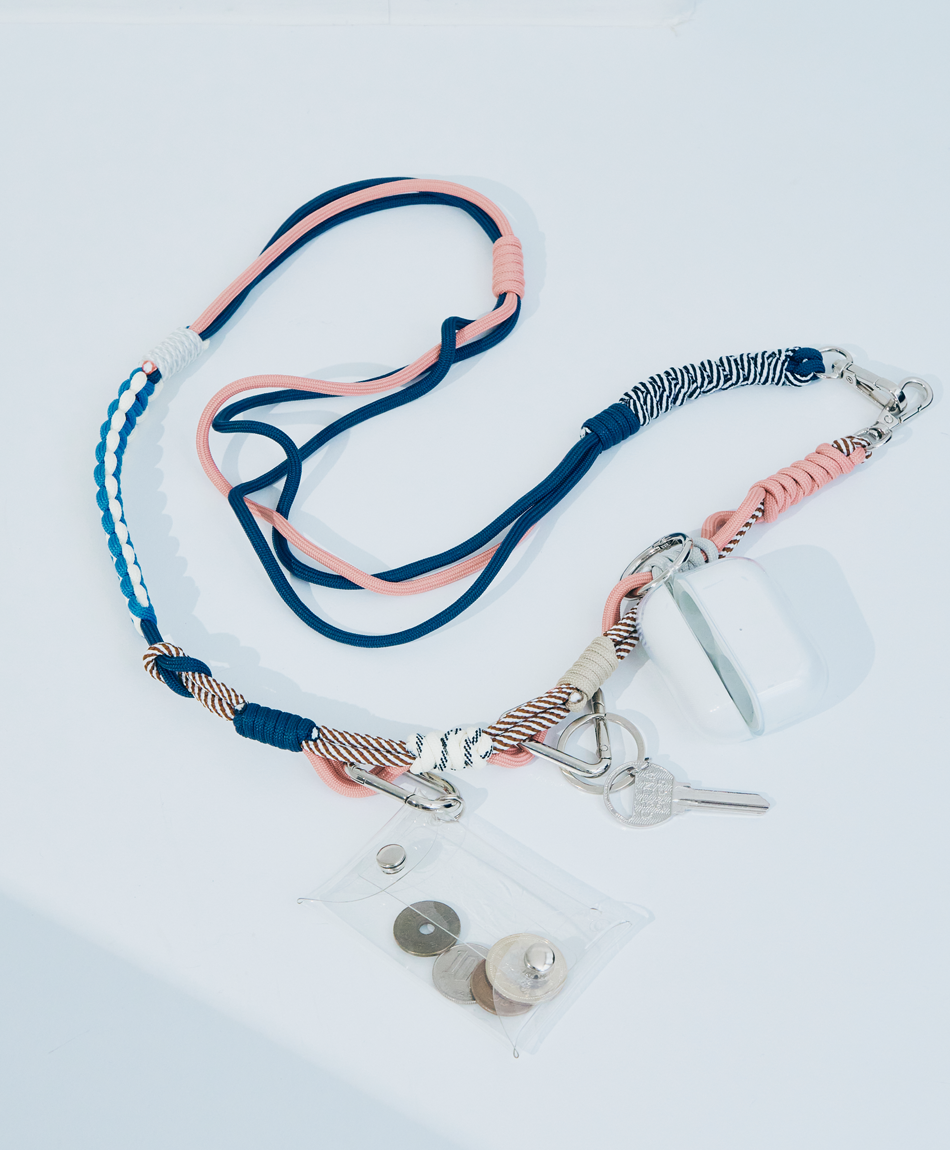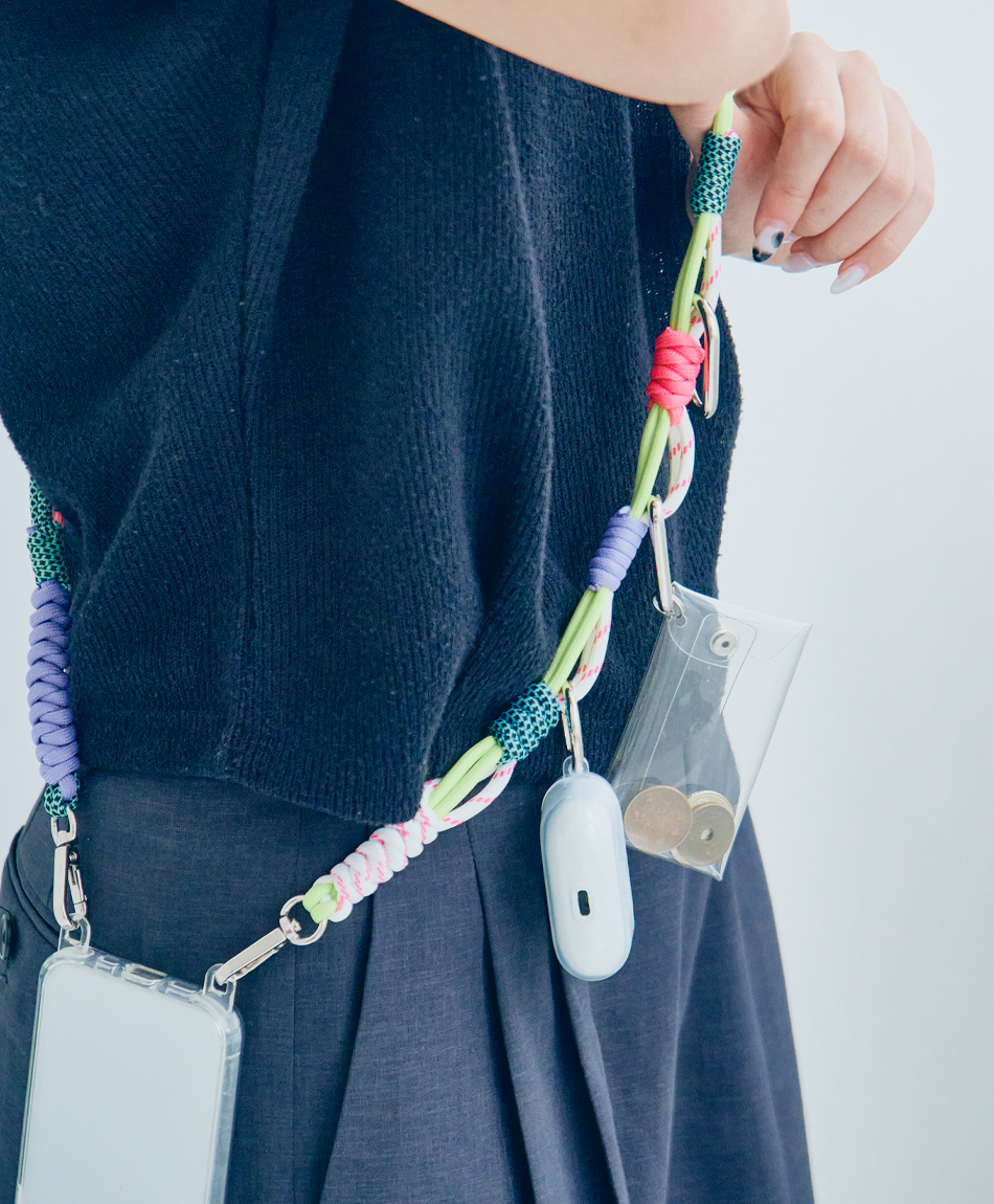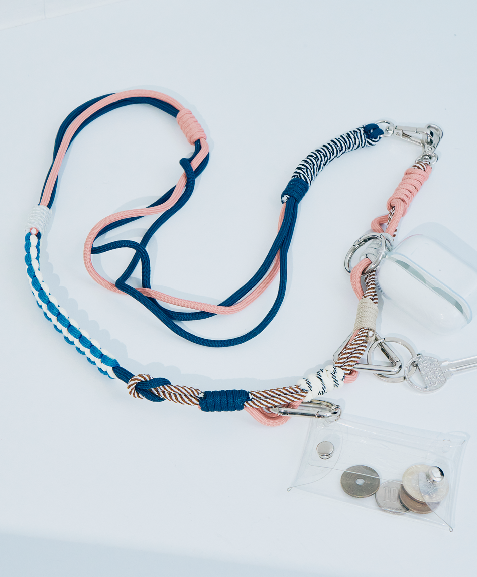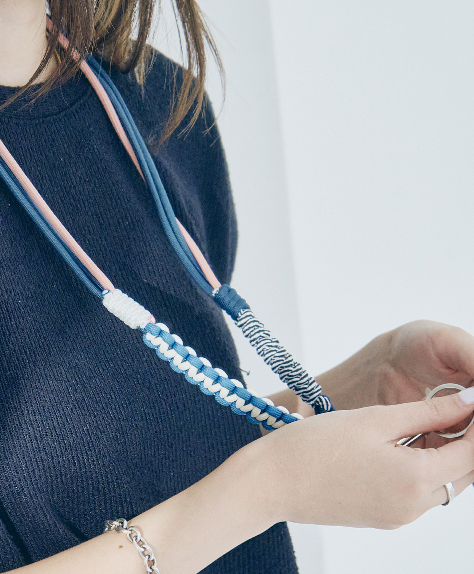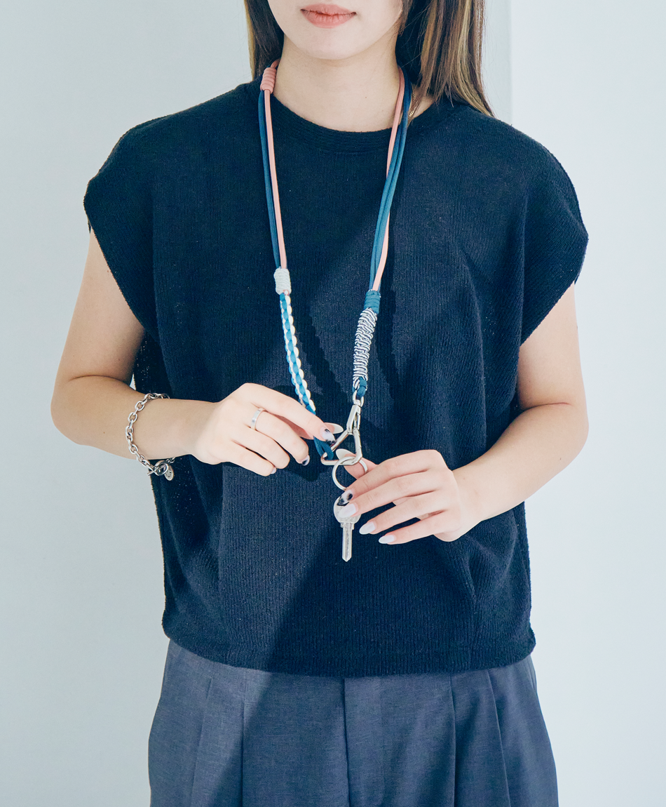 短い方はバッグにつけたり、紐部分は取り外し可能で、長いストラップはネックストラップに。スマホやネームカードを下げて、首からぶら下げて使えます。