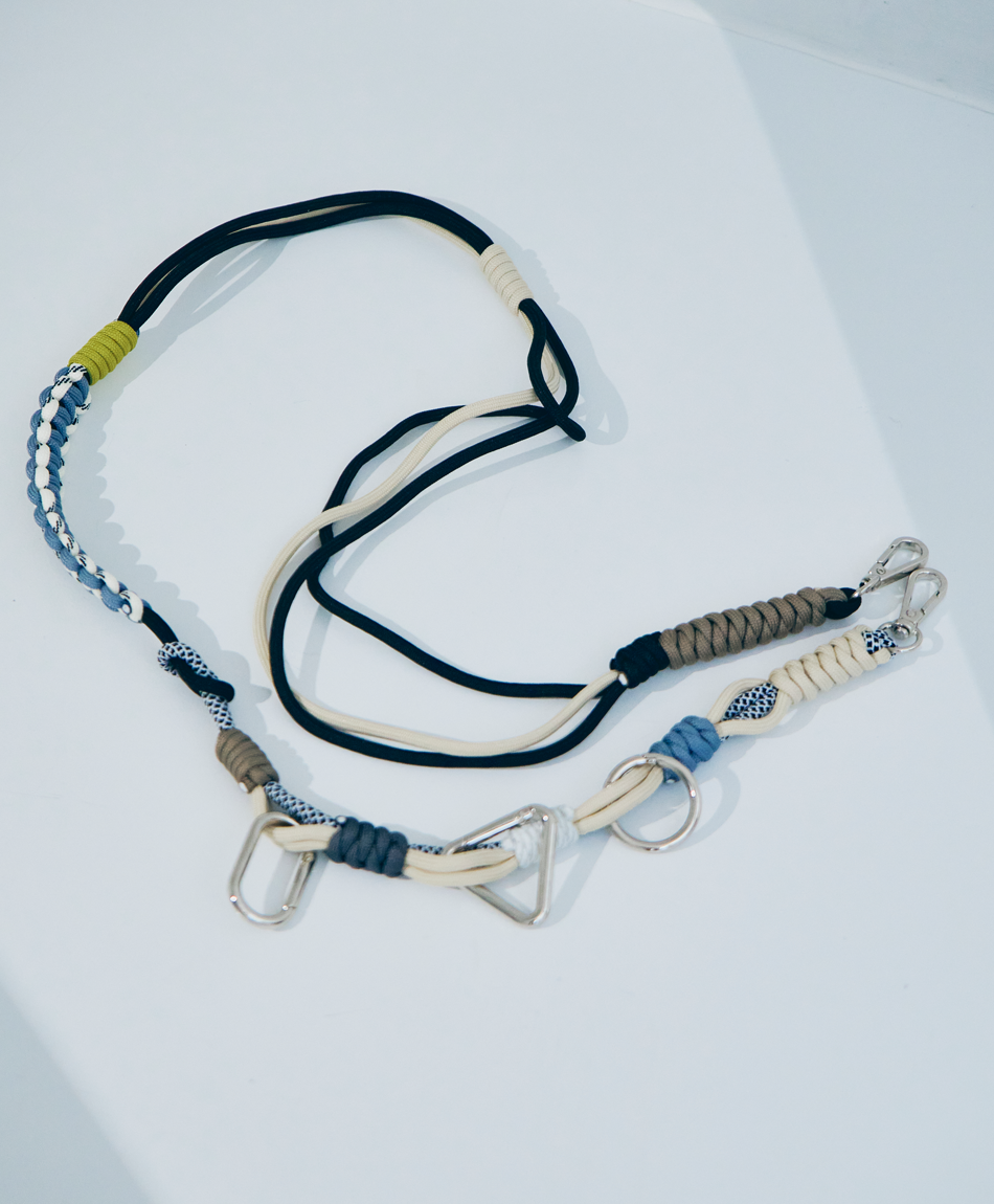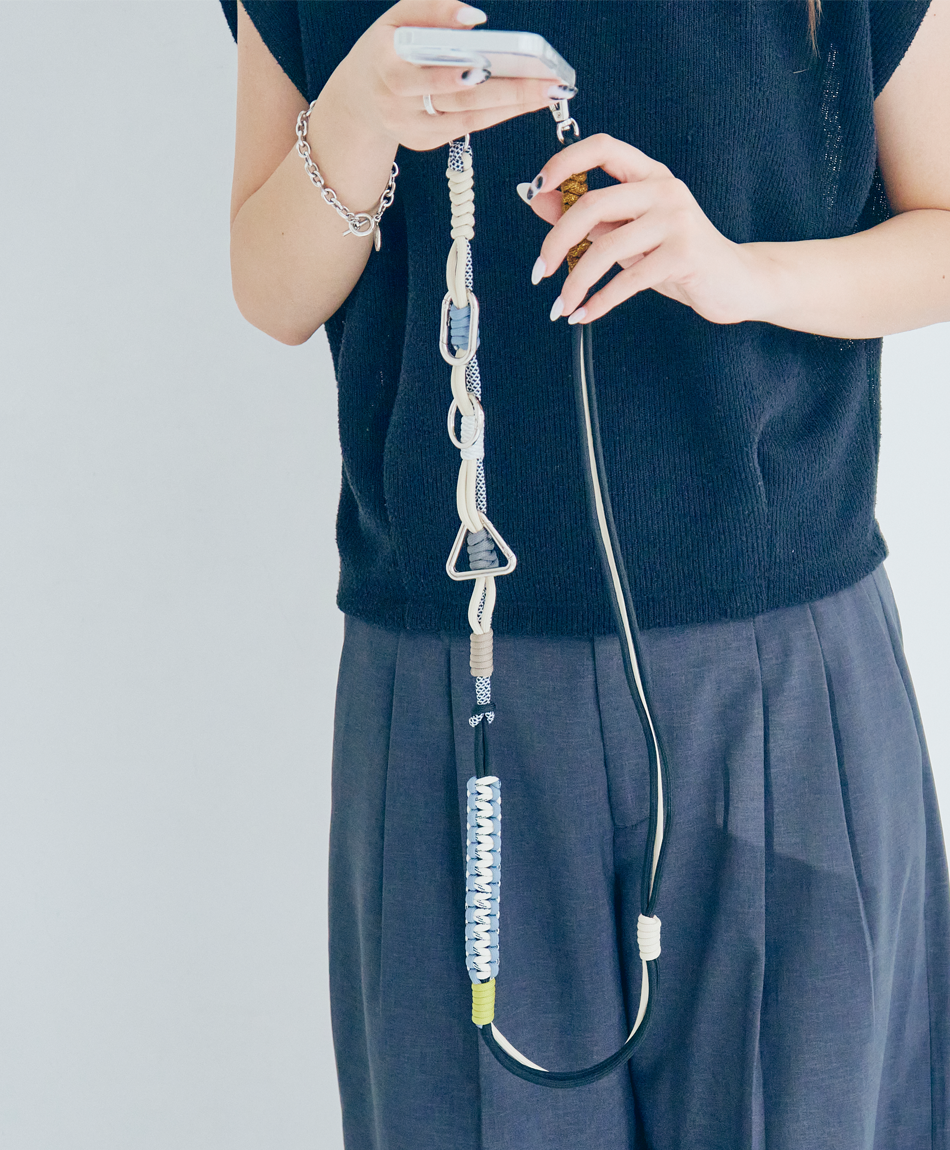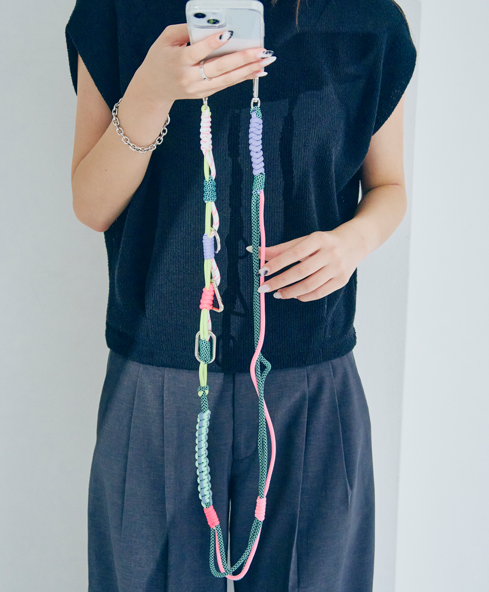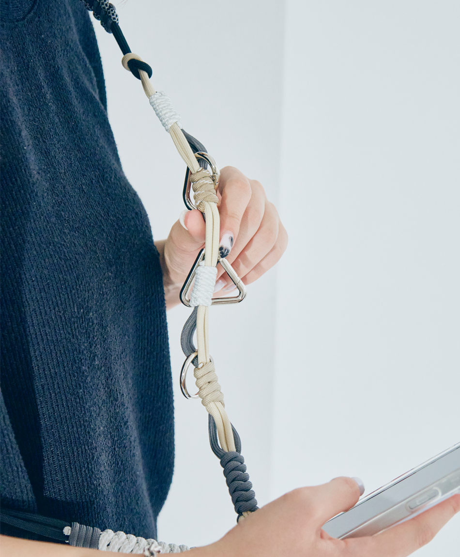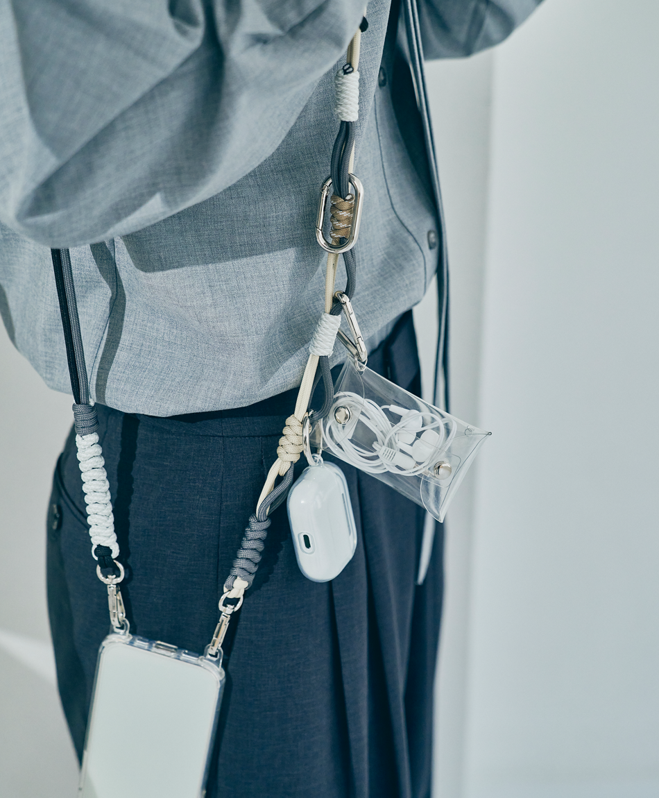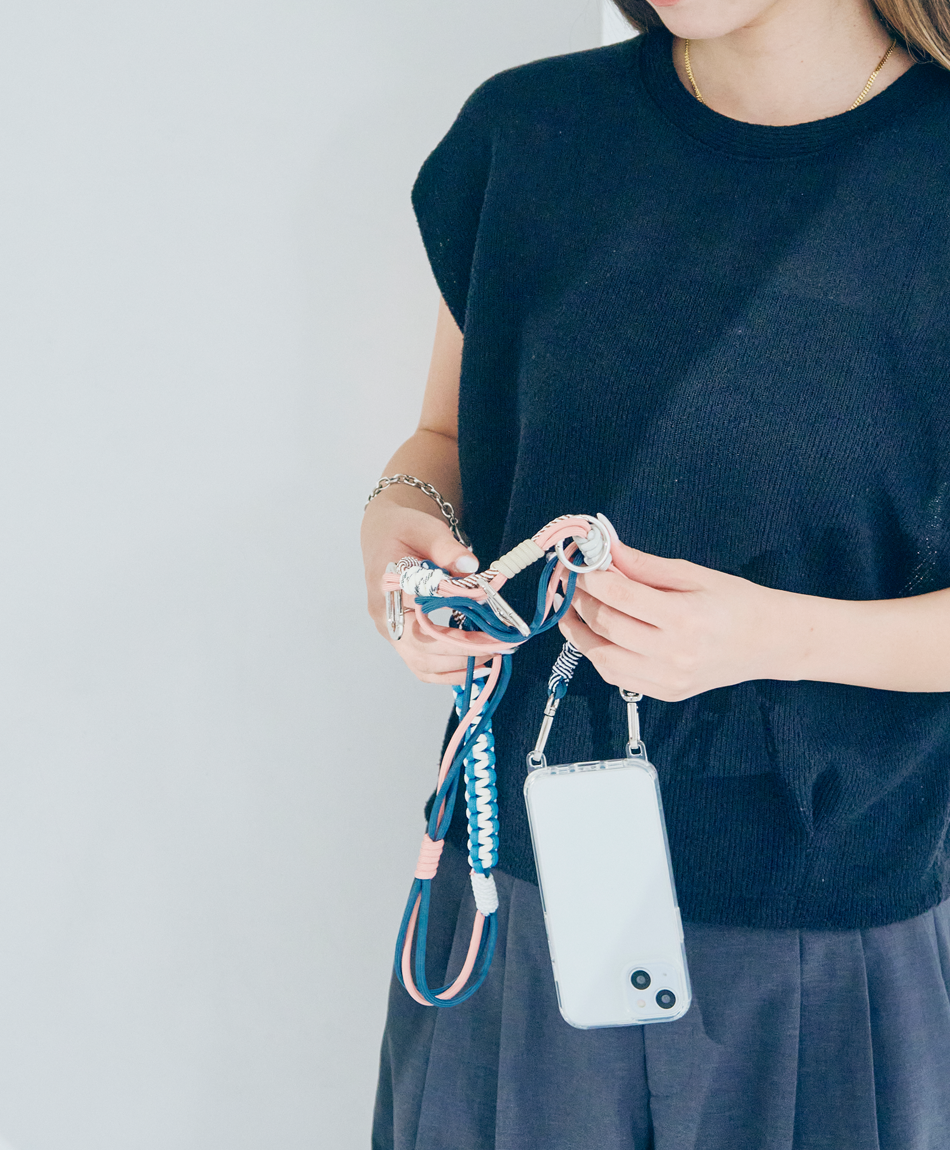 短い方はバッグにつけたり、紐部分は取り外し可能で、長いストラップはネックストラップに。スマホやネームカードを下げて、首からぶら下げて使えます。