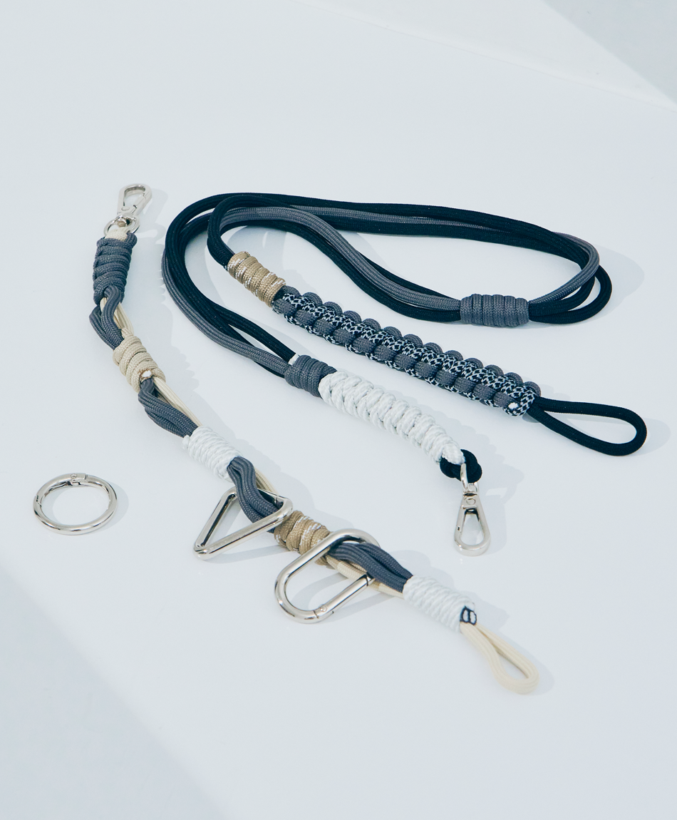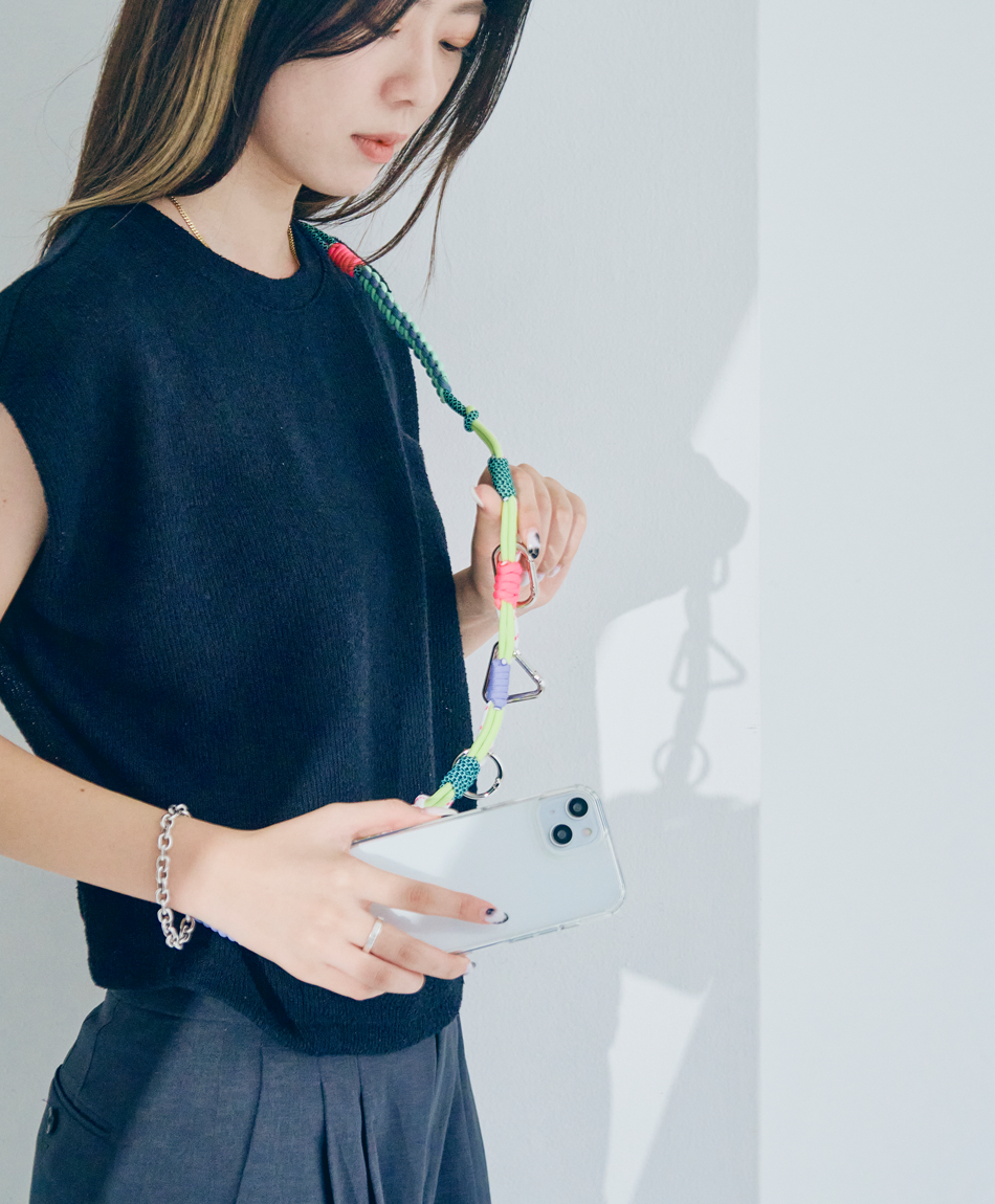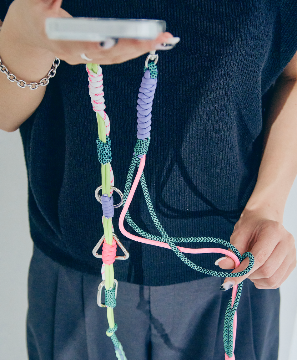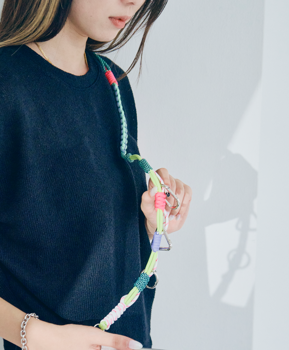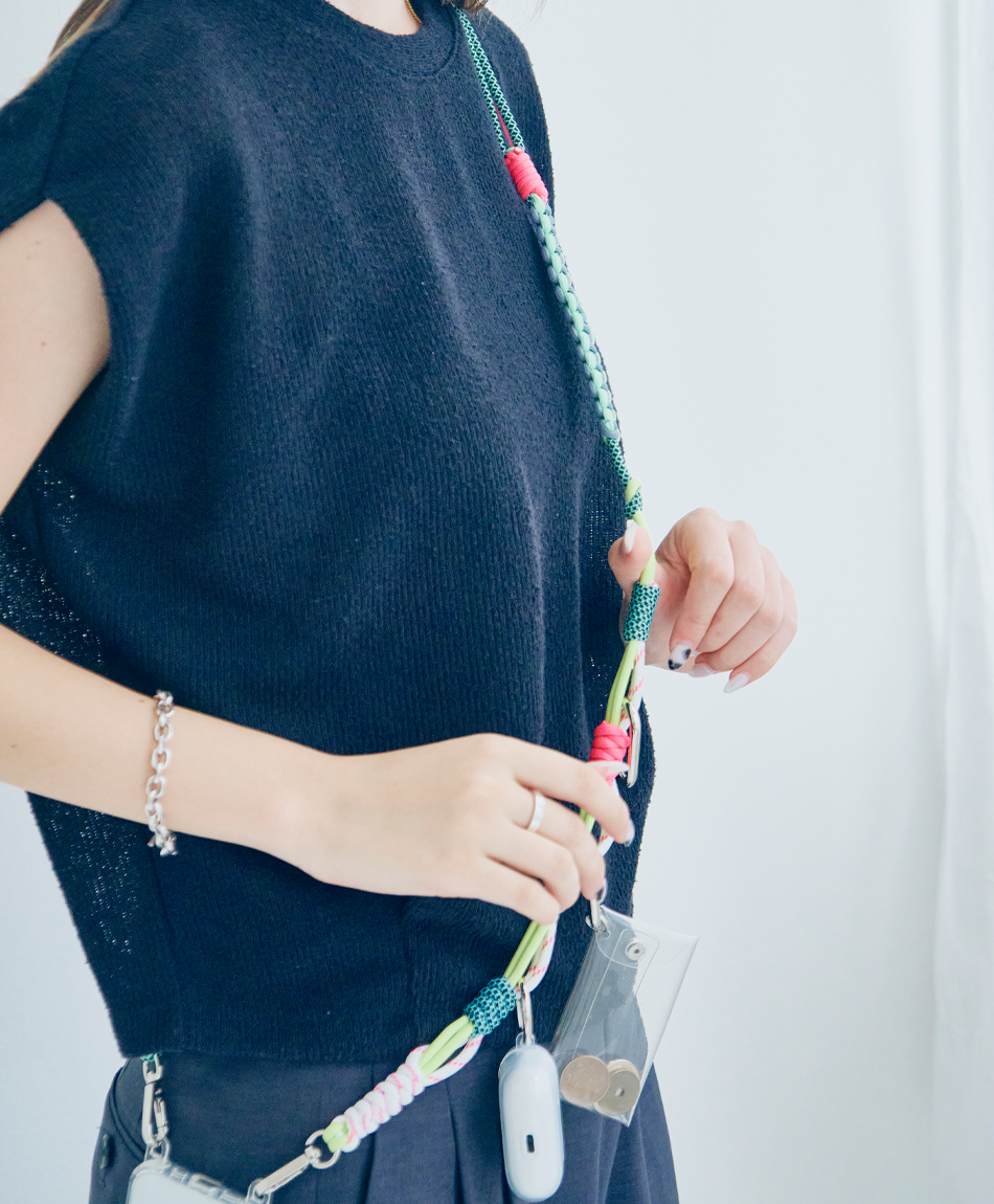 短い方はバッグにつけたり、紐部分は取り外し可能で、長いストラップはネックストラップに。スマホやネームカードを下げて、首からぶら下げて使えます。