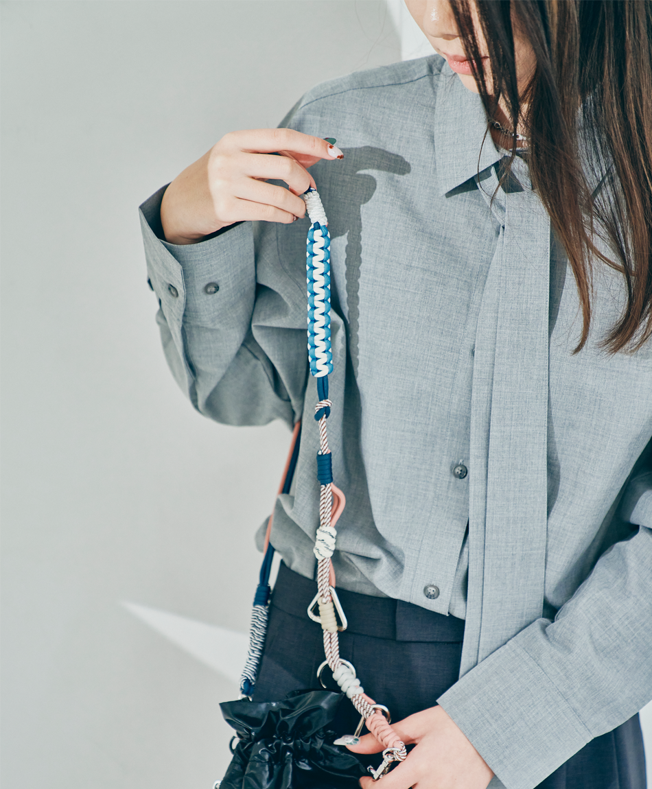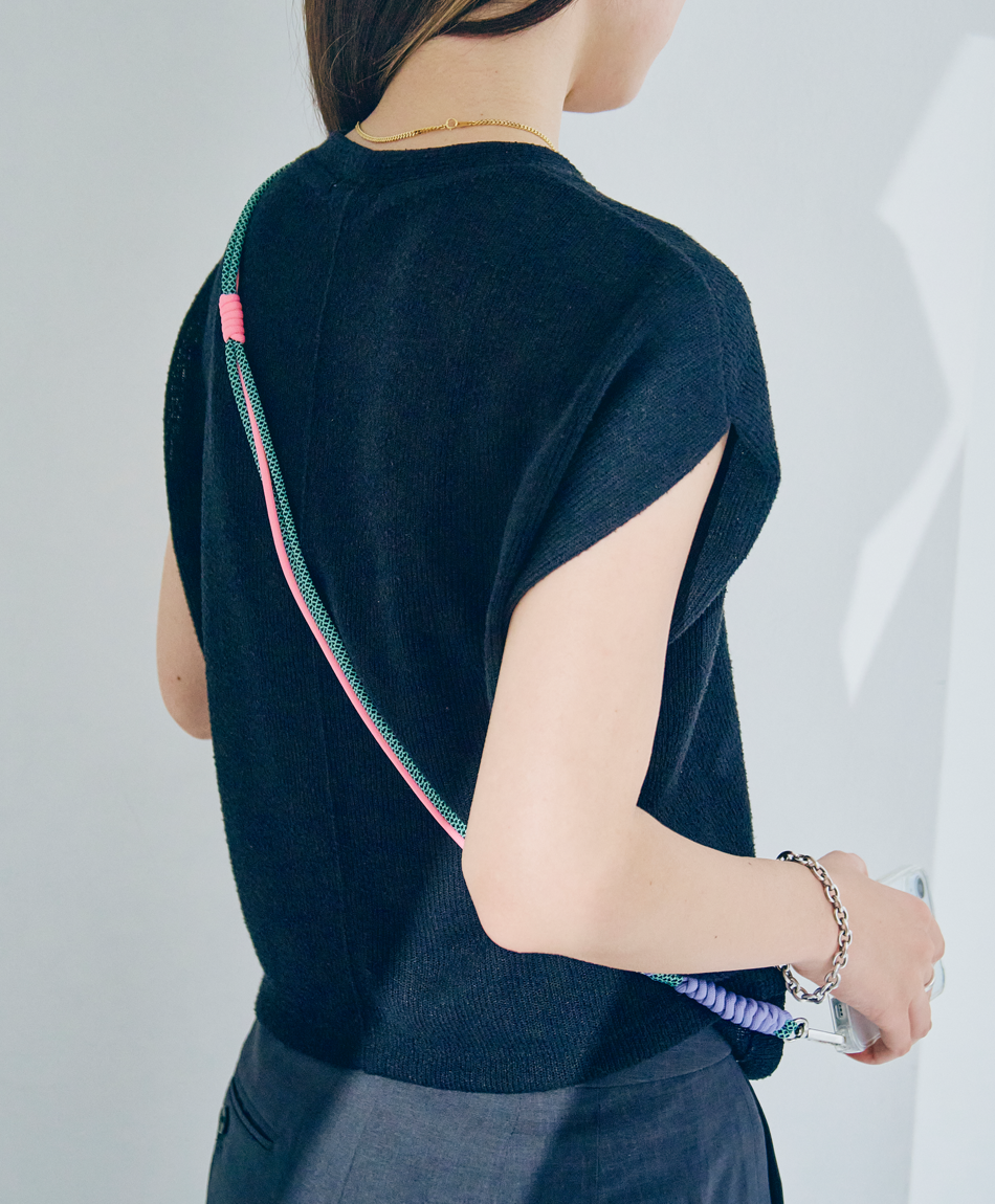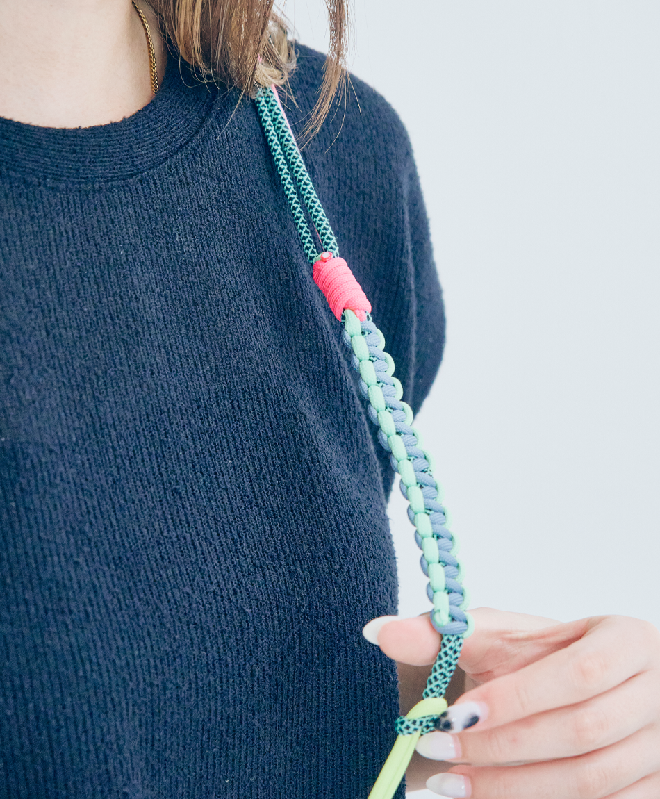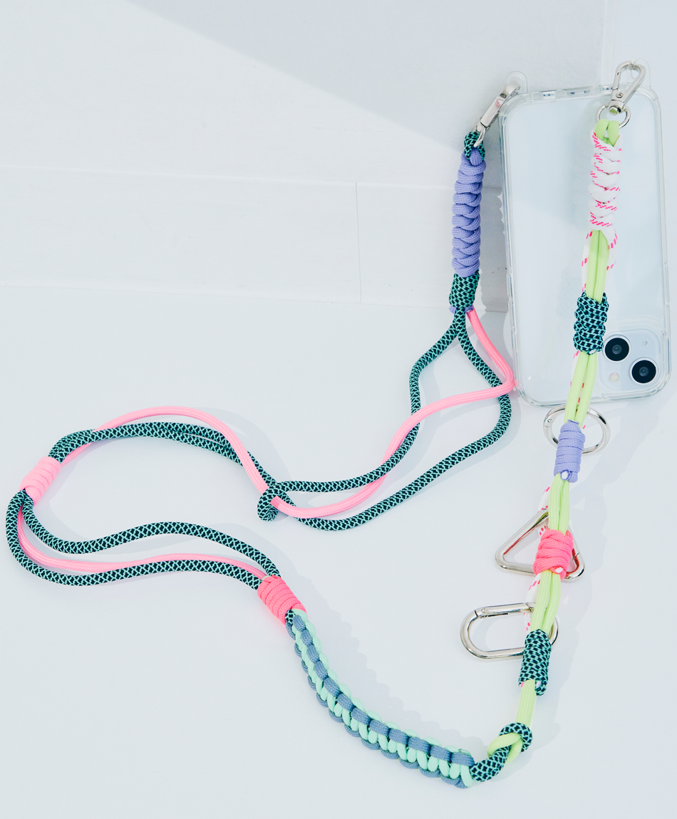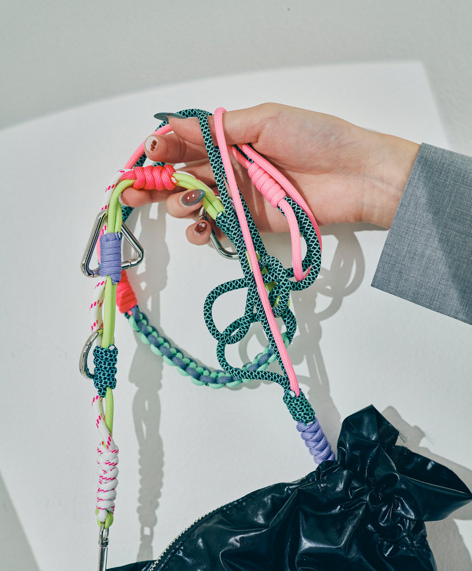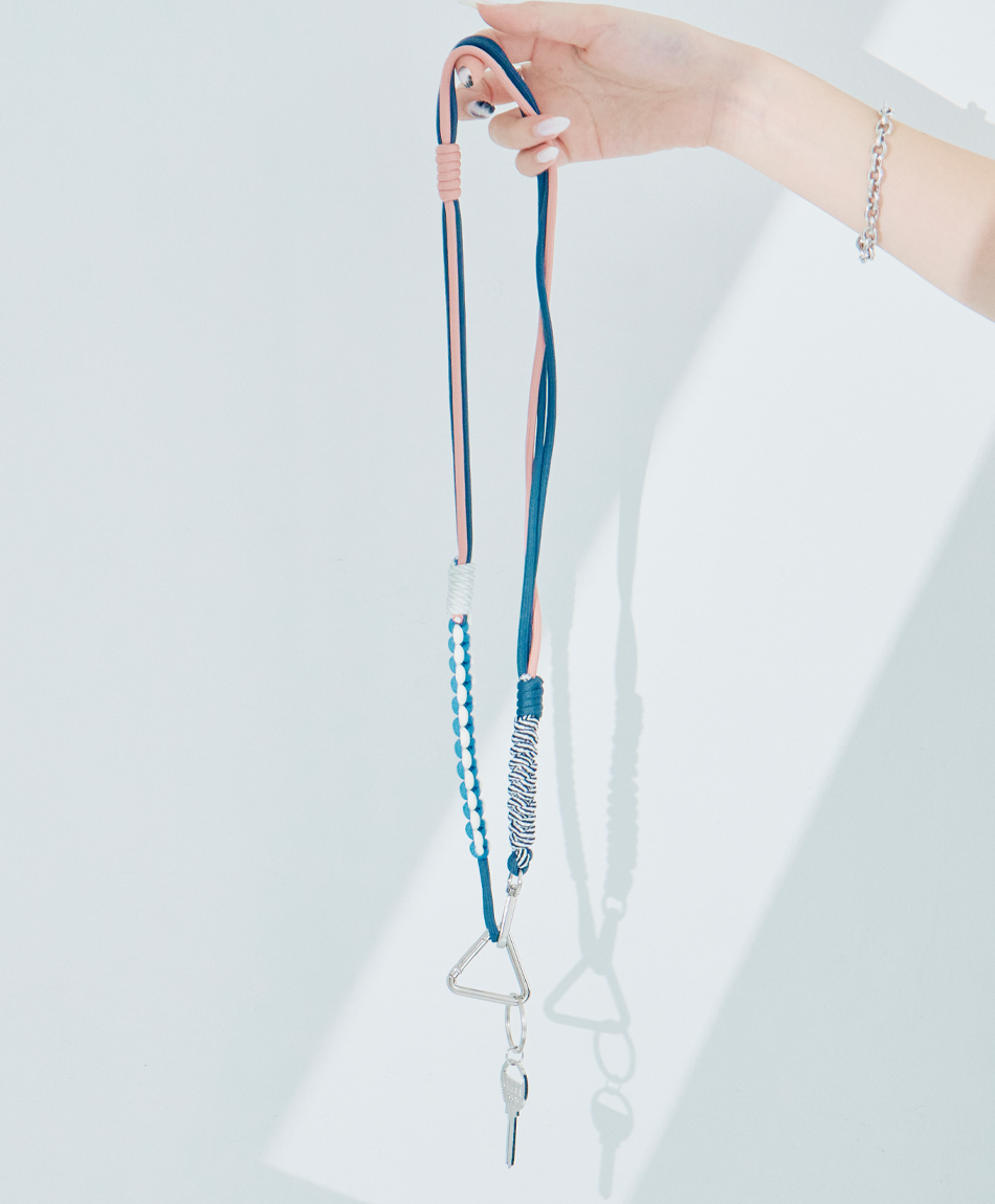短い方はバッグにつけたり、紐部分は取り外し可能で、長いストラップはネックストラップに。スマホやネームカードを下げて、首からぶら下げて使えます。