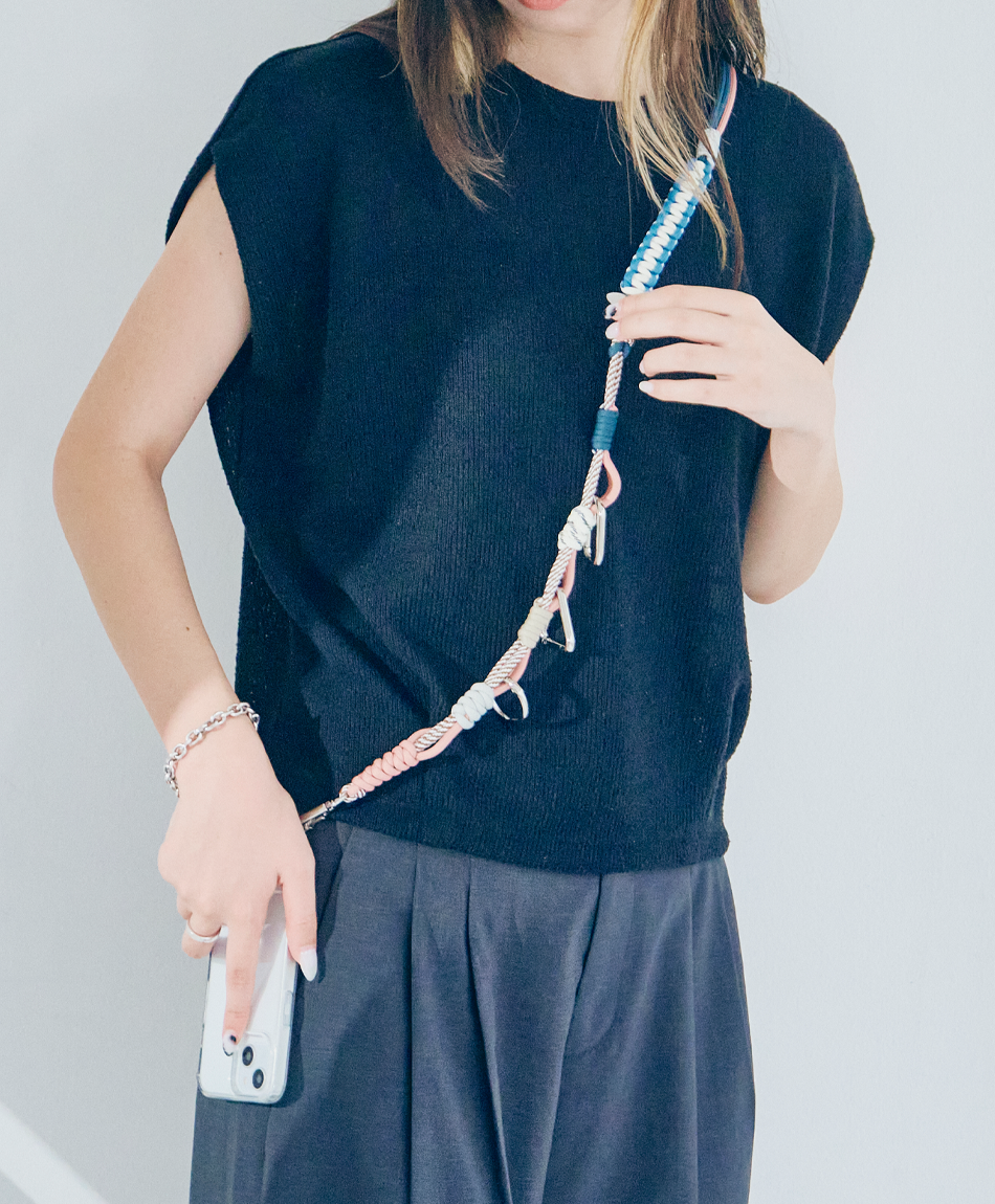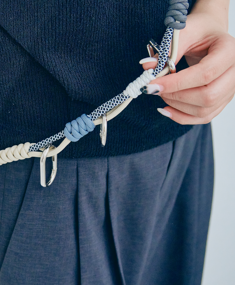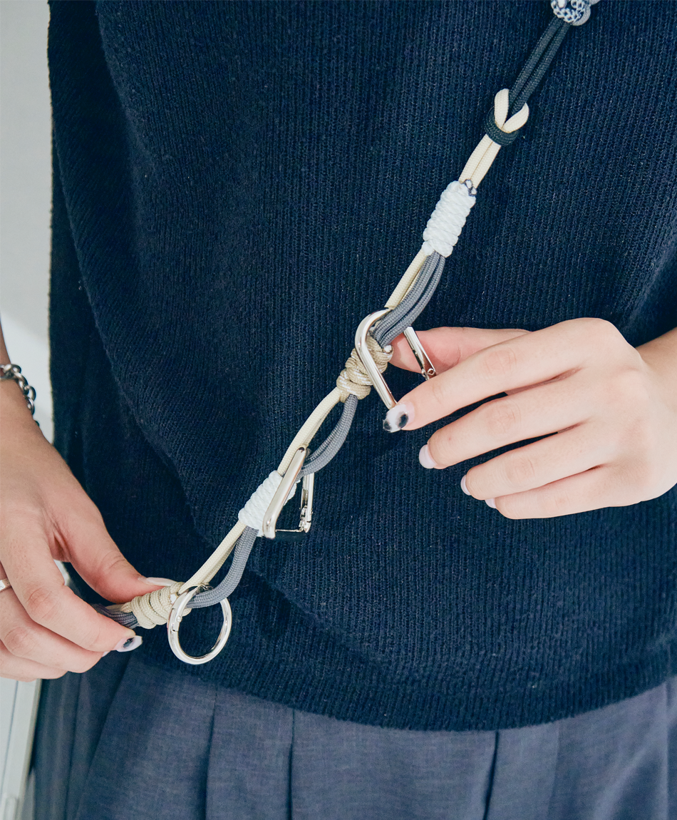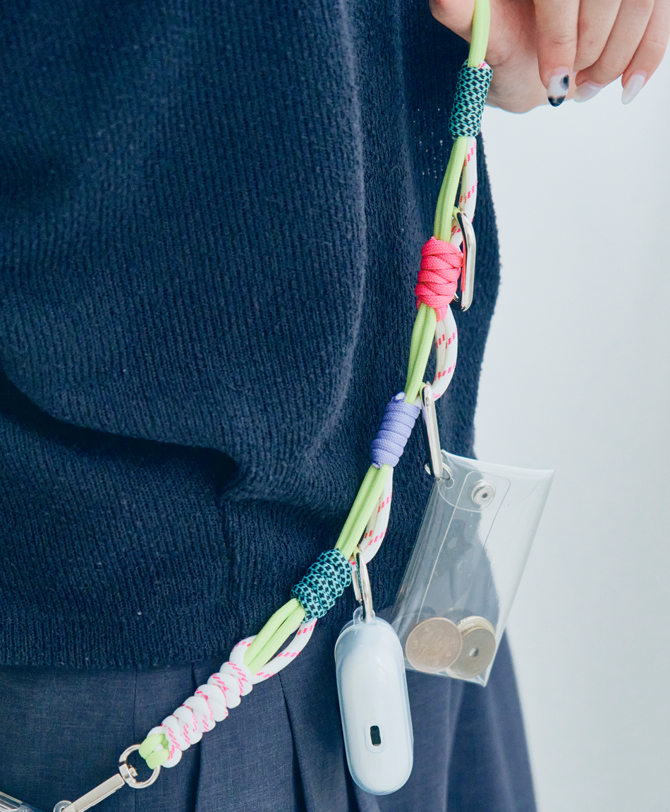 ウエスト部分につけてスマホや財布にウォレットチェーンのように使用したり、長すぎる場合は結んで少し調節もできます。