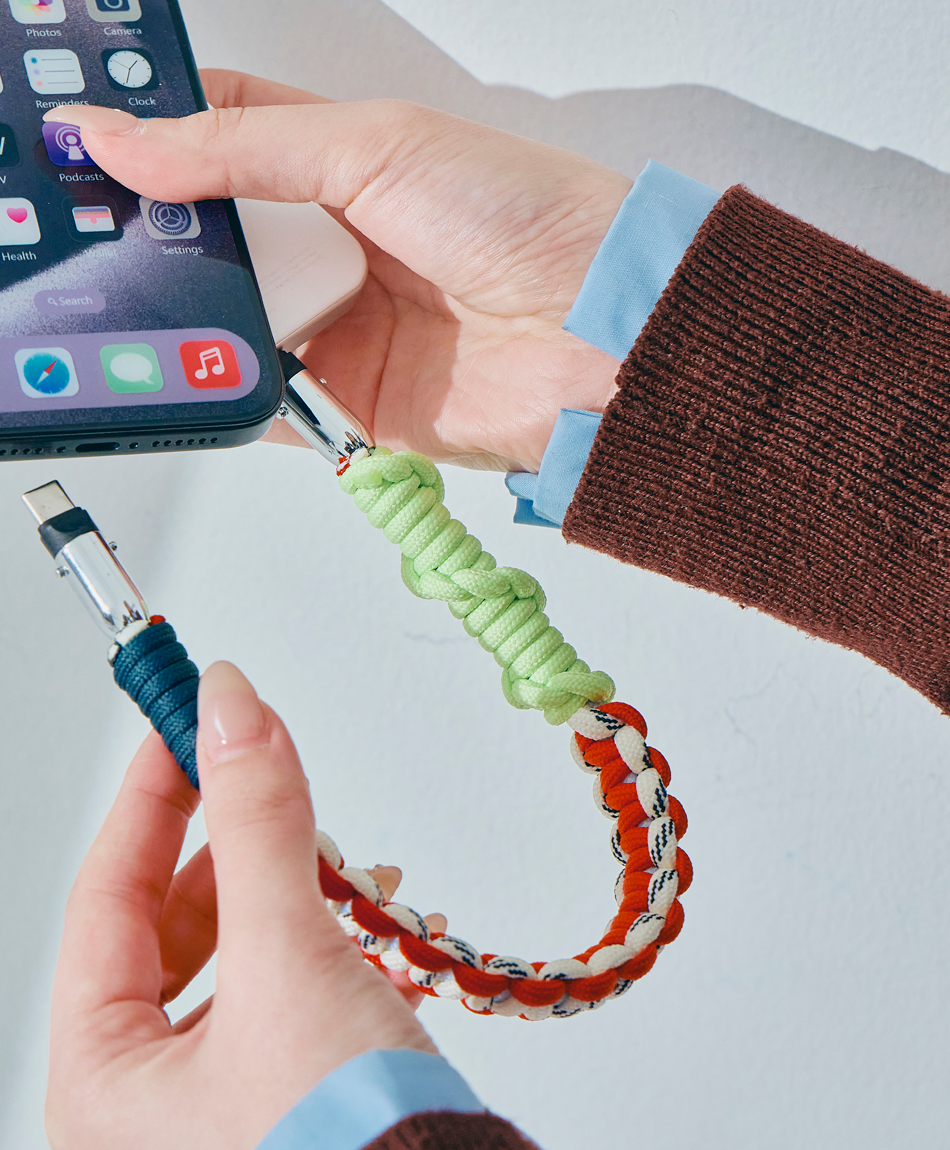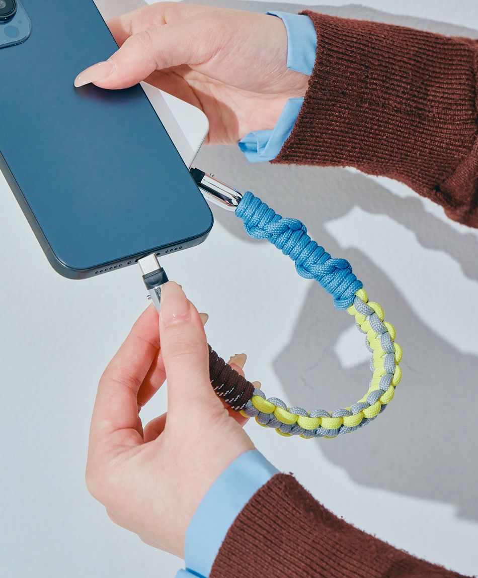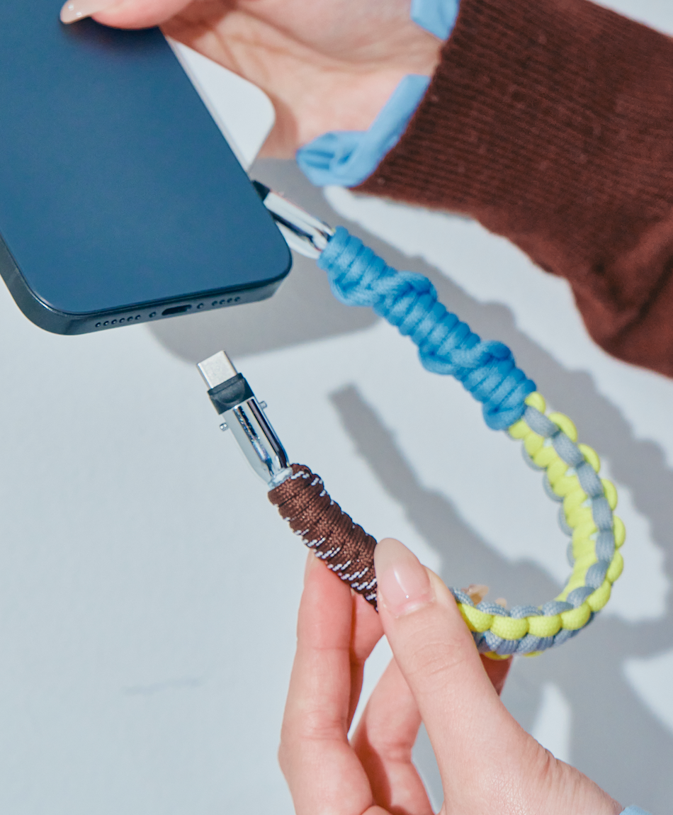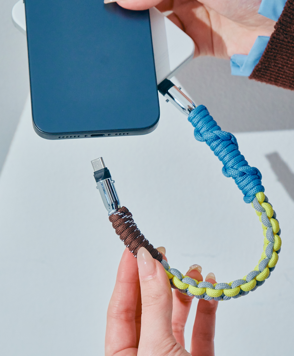 一見すると、ボリューム感のあるトレンドのパラコード編みストラップ。でも実は、先端のパーツを外せば「急速充電対応のケーブル」に早変わり!キャンプやフェスなどのアウトドアシーンはもちろん、モードな街歩きスタイルにも馴染むタフで都会的なデザインです♪「バッテリーが足りない!」と思ったら、手首のストラップを外すだけ。バッグの奥底で絡まったケーブルを探す手間も必要ありません!